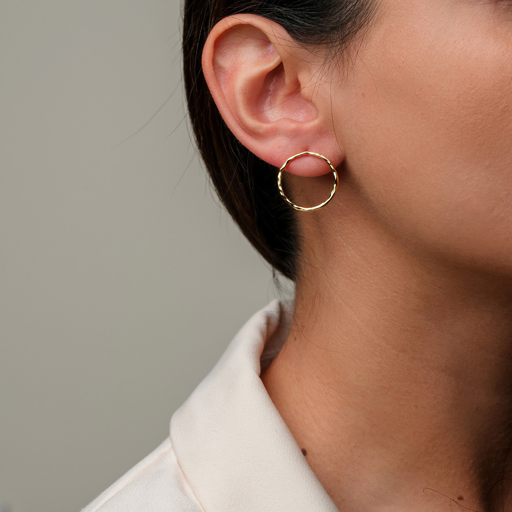 Delightful sterling silver casual earrings with an imperfect circular shape. Imperfection makes beauty. Gold plated 18K.
